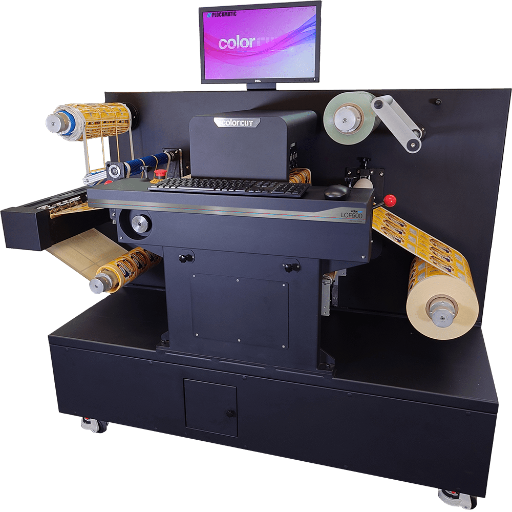 מערכת רול טו רול לציפוי למינציה, חיתוך KISS-CUT קילוף ואיסוף שאריות מדבקה ,תוצרת Plockmatic/Morgana. מאפשרת להתמודד עם עבודות שונות ומתכווננת אוטומטית באמצעות קורא הברקוד((QR CODE. המערכת נועדה לפתרון מהיר, פשוט ומדויק לכמויות בינוניות.